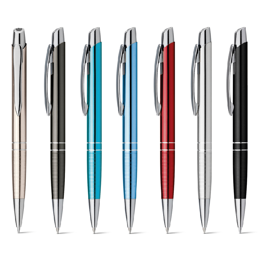 Esferográfica em alumínio com clipe. Disponível numa variada gama de cores. Escrita em azul.