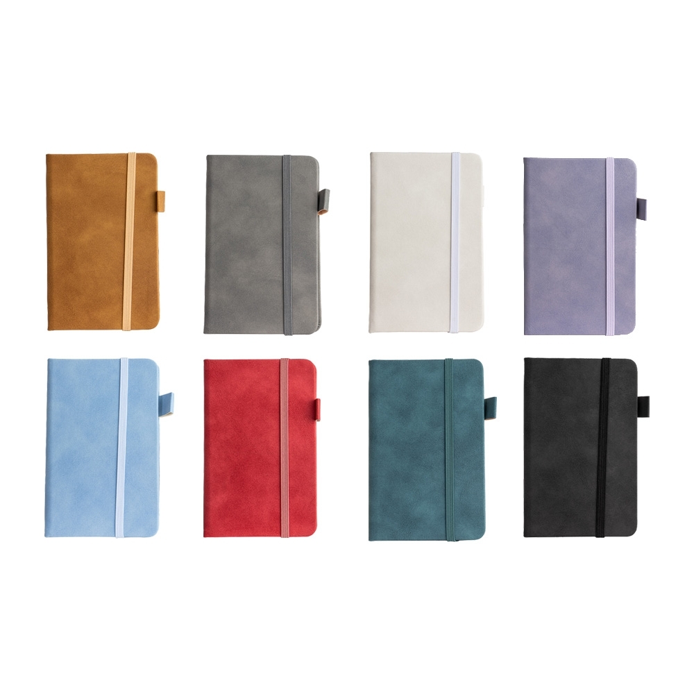 Descrição: Caderneta em PU com marcador de página em cetim e fita elástica para fechar. Contém aproximadamente 80 folhas amareladas com pauta.