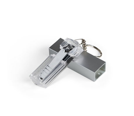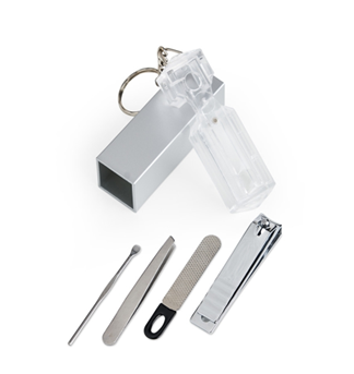 Descrição: Chaveiro kit manicure 4 peças em estojo plástico. Possui lixa, pinça, empurrador de cutícula e cortador de unha preso.