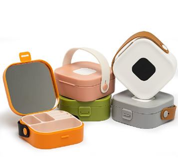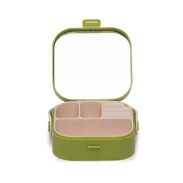 Descrição: Porta-joias com espelho, produzido em plástico com alça de couro sintético e berço de silicone removível.