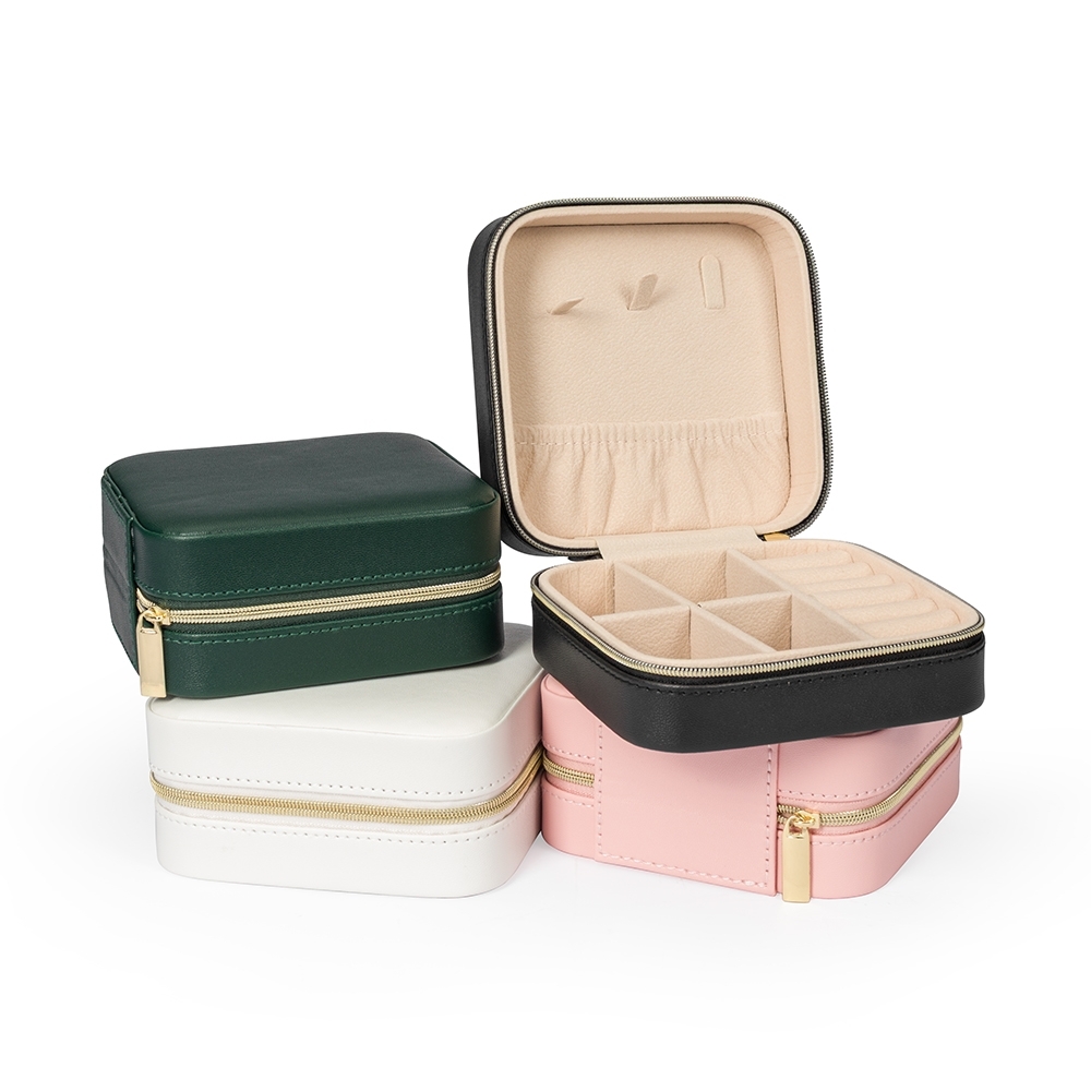 Descrição: Porta-joias em couro sintético. Possui revestimento interno com textura macia e fechamento em zíper, três mini ganchos, um bolso com elástico, uma divisória removível com quatro quadrantes e um compartimento estofado com ranhuras.
