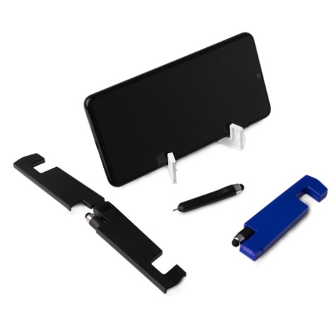 Descrição: Suporte plástico dobrável para celular, acompanhado de uma mini caneta com ponta touch