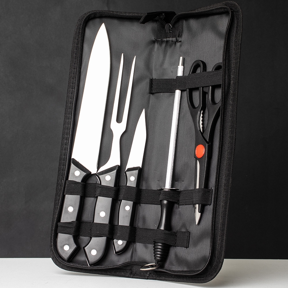 Descrição: Churrascos irresistíveis começam com os utensílios certos! Nosso kit de 5 peças em inox, com cabos plásticos e estojo em nylon, inclui: uma faca chef de 7 polegadas, versátil para diversas tarefas na cozinha; uma faca de legumes de 3 polegadas, ideal para descascar e cortar vegetais; um garfo perfeito para dominar a grelha; uma chaira, essencial para manter as facas sempre afiadas; e uma tesoura multiuso para cortar alimentos, legumes, verduras e carnes. Além disso, a tesoura possui pequenos dentes entre os cabos que funcionam como um quebra-nozes. O kit também acompanha uma plaquinha de metal, permitindo personalizar e dar um toque único ao churrasco. Este kit é perfeito para preparar churrascos deliciosos!