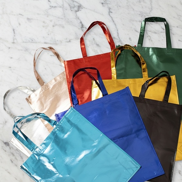 Descrição: Sacola confeccionada em TNT com revestimento externo laminado e duas alças costuradas.