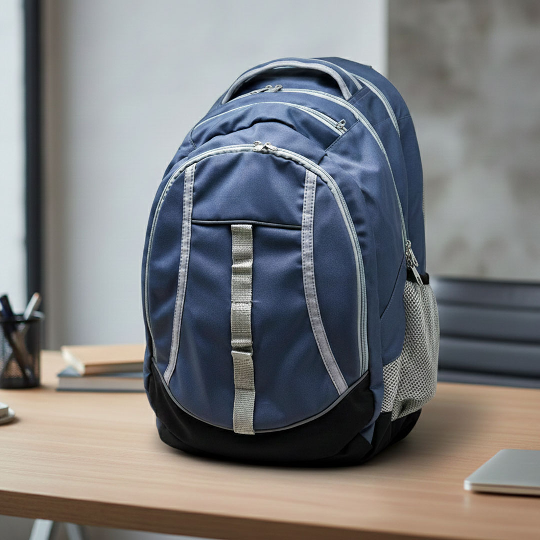 Mochila em nylon, 3 compartimento, bolso para óculos, divisória para notebook, 2 bolsos laterais em tela e fechamento em zíper.