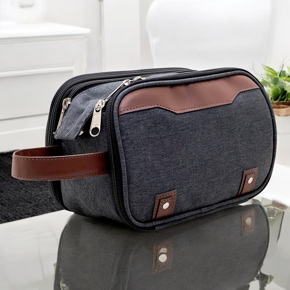 Nécessaire em nylon mescla com 3 compartimentos, fechamento em zíper, alça de mão no couro sintético.