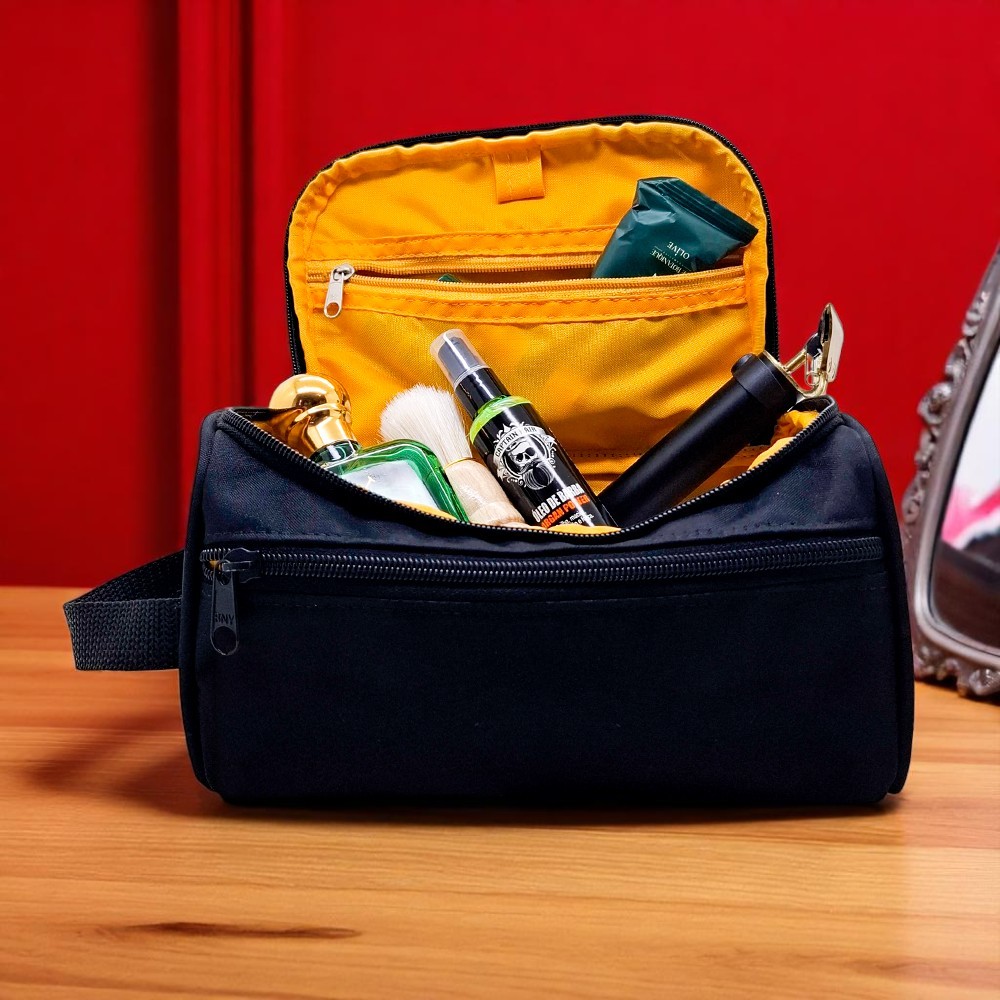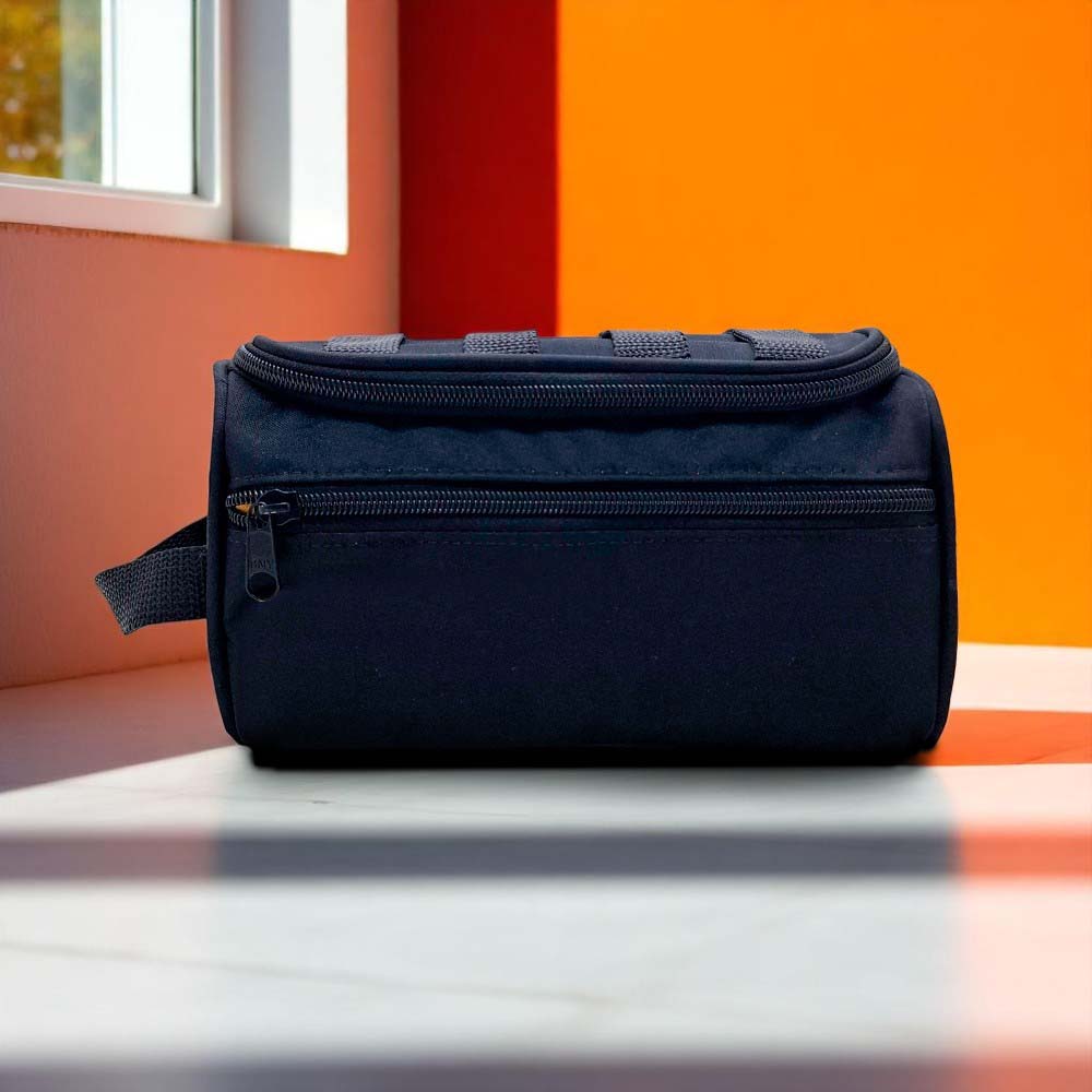 Nécessaire em nylon, com 2 compartimento, fechamento em zíper e alça de mão em fita CA 25mm com etiqueta