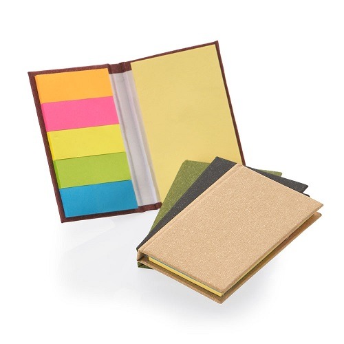 Bloco de anotações com capa dura, stiky notes.