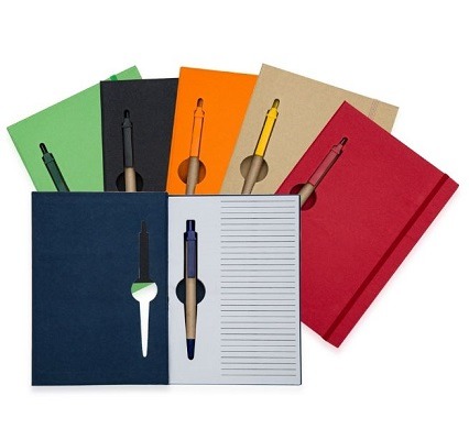 Possui fita elástica para lacrar o bloco e verso liso. Caneta ecológica de papelão com clip e ponteira plástica.
