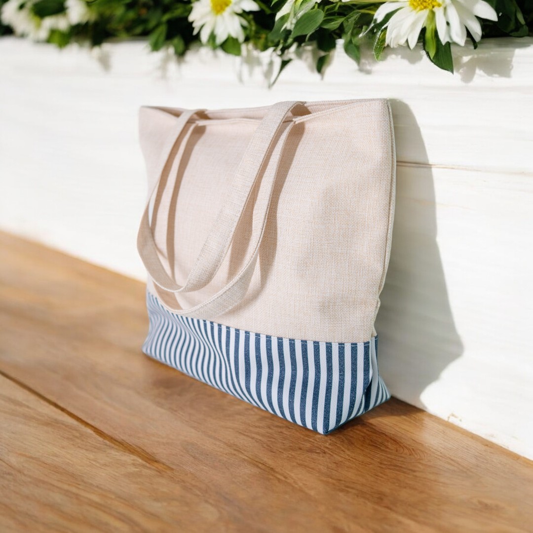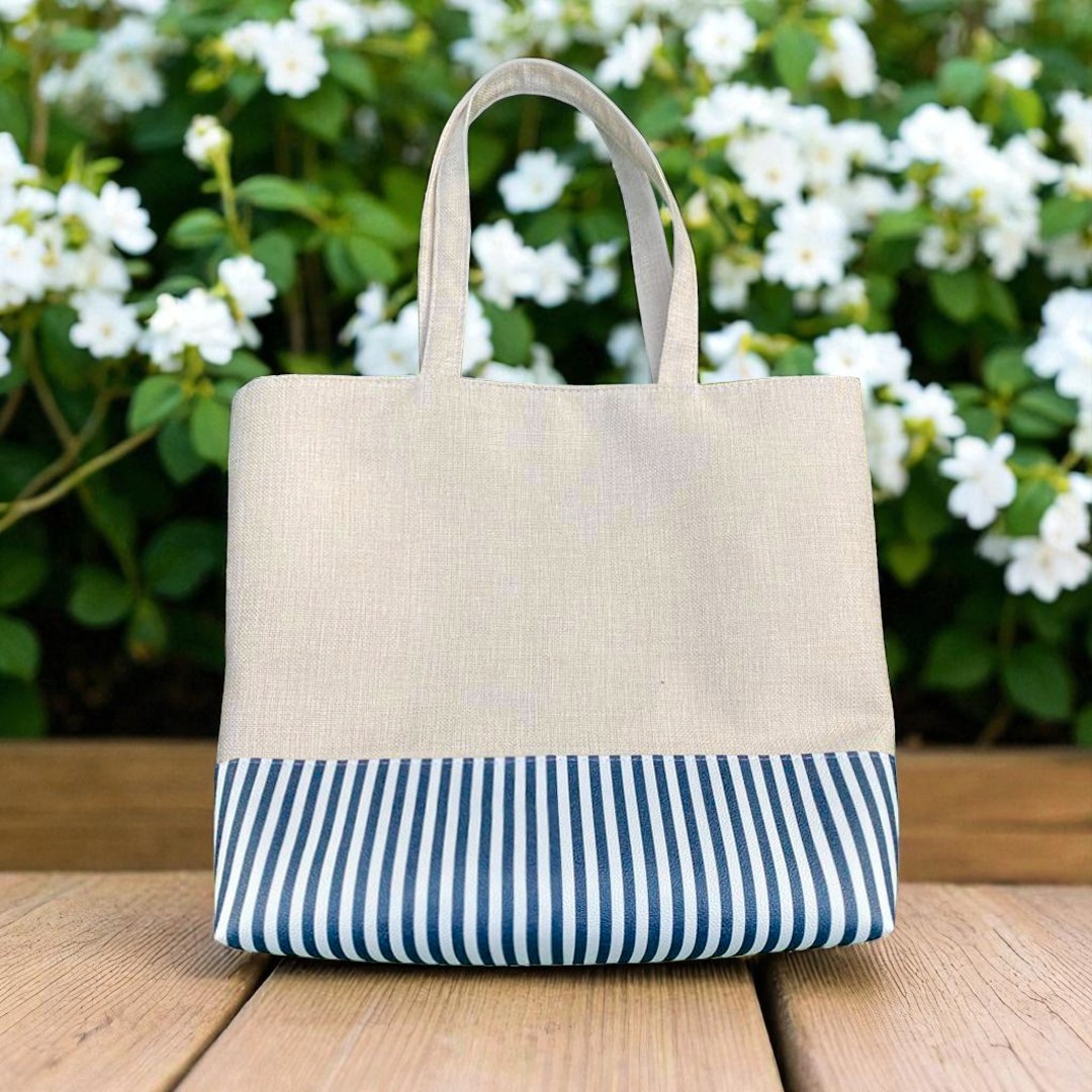 Bolsa em juta, fundo em sintético listrado e fechamento botão imã.