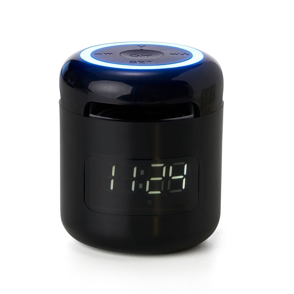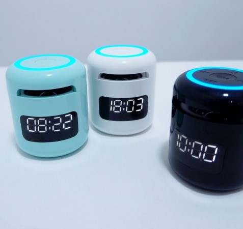 Descrição: Caixa de som multimídia com relógio despertador. Produzida em plástico e com borrachas antiderrapantes na área inferior, a caixa de som tem bateria de longa duração, display de LED na área frontal, e anel de led brilhante na parte superior. A caixa de som executa nos modos bluetooth, rádio FM, cartão TF-microSD e entrada auxiliar P2. Acompanha cabo USB e manual em inglês e chinês.