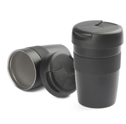 Caneca em aço inox com parede dupla isolada a vácuo com capacidade de até 350ml, conserva temperatura quente ou fria, pegador em silicone e bico com tampa.