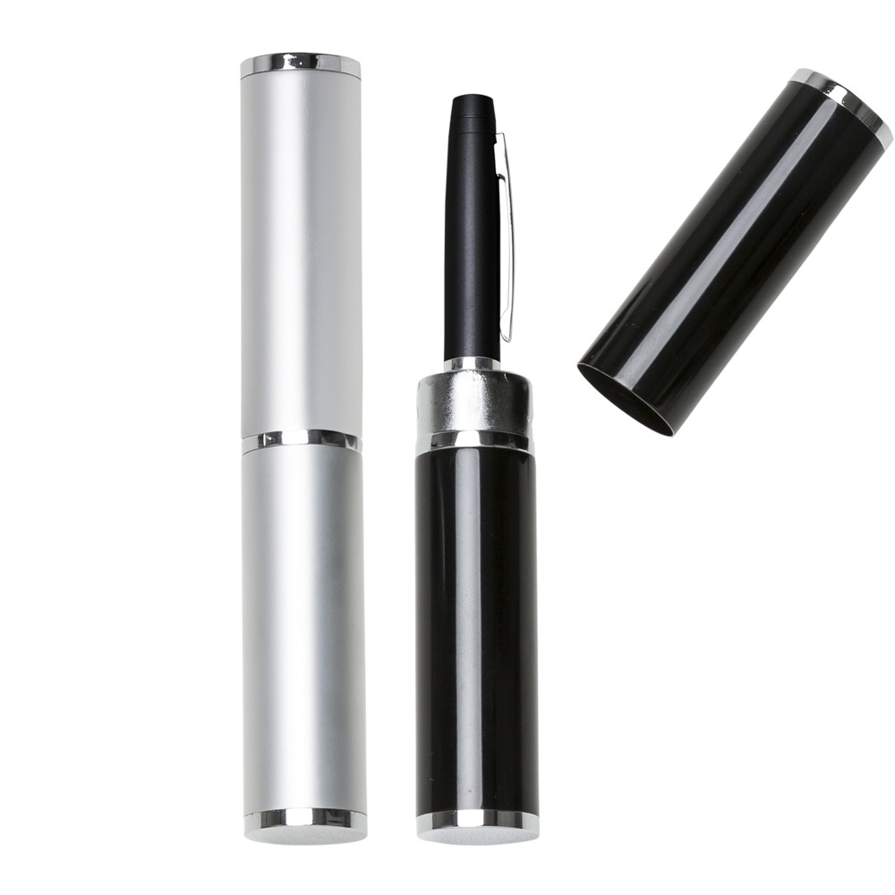 Caneta metal com estojo tubo. Caneta inteira colorida com detalhes prata, possui dois anéis em relevo na parte superior