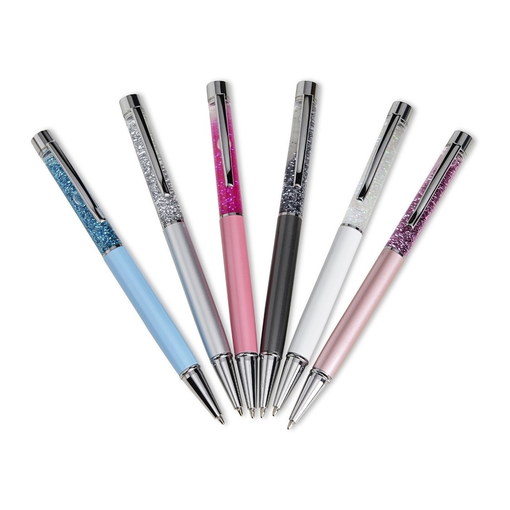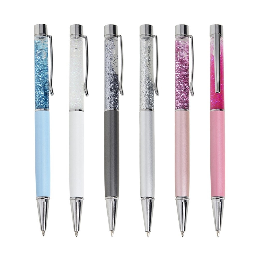 Descrição: Caneta metálica com glitter, acionamento por rotação e carga esferográfica 1.0mm azul.