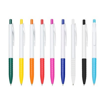 Caneta plástica branca com detalhes coloridos. Clip plástico com detalhe vazado nas laterais, acionador e parte inferior colorida com oito anéis em relevo. Aciona por clique.