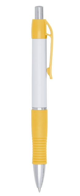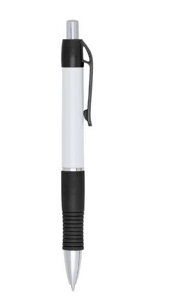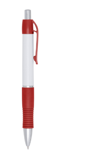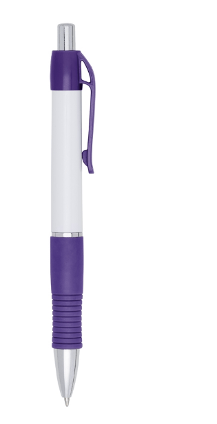 Possui clip plástico colorido, anel central prata e parte inferior emborrachada colorida com relevo .