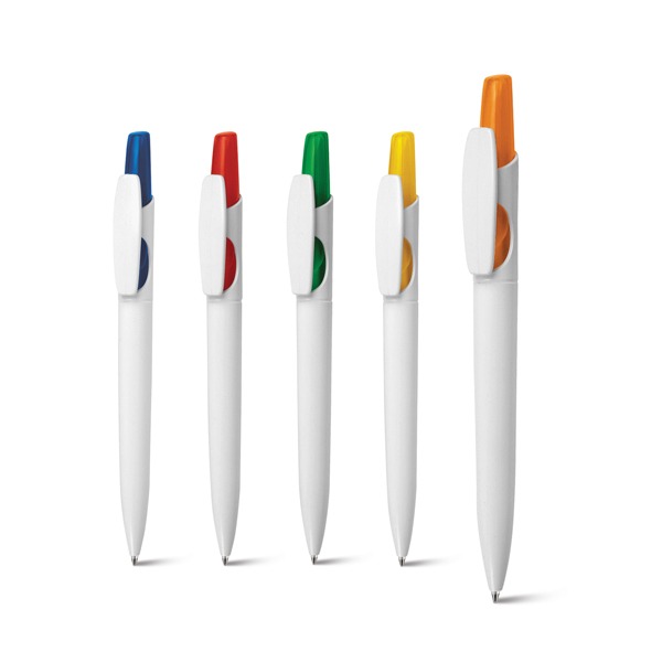 Esferográfica. Acabamento brilhante. Ponteira frost colorida.