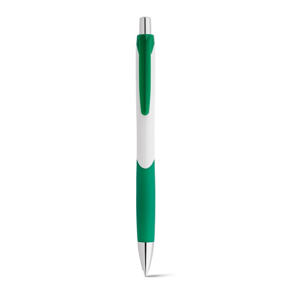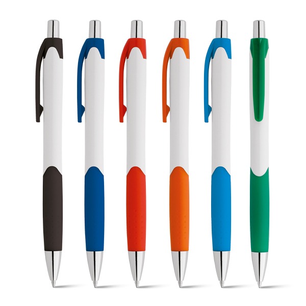 Esferográfica. ABS. Com grip. Acabamento brilhante. Ponteira cromada.
