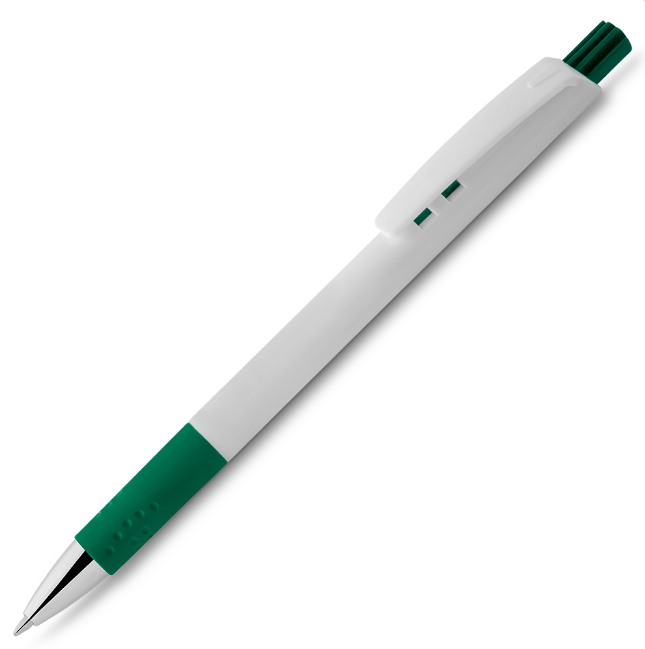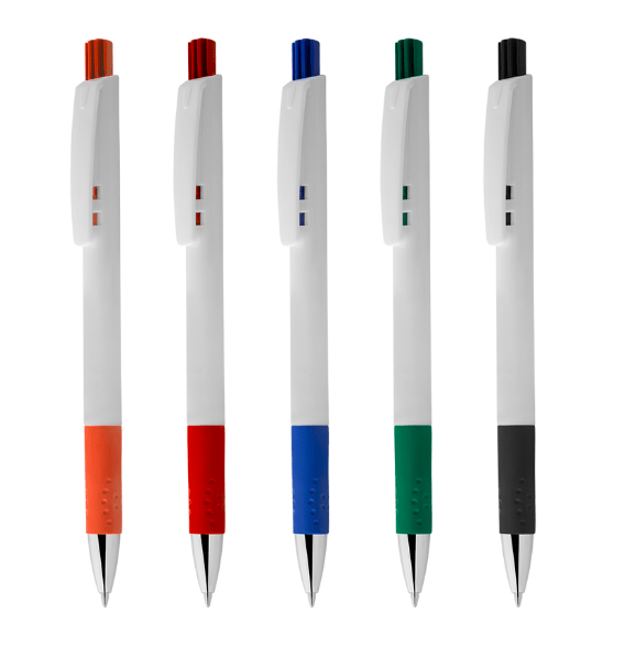 Caneta plástica com grip esferográfica retrátil.