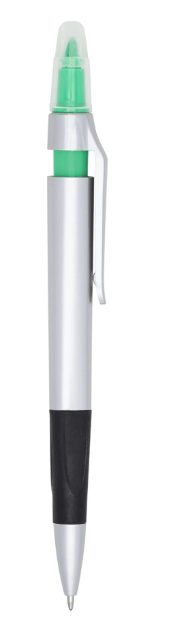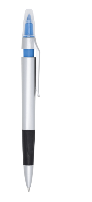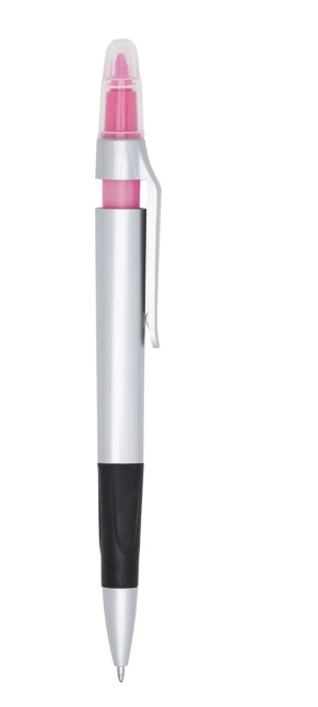 Caneta plástica esferográfica e marca texto, com corpo prata.