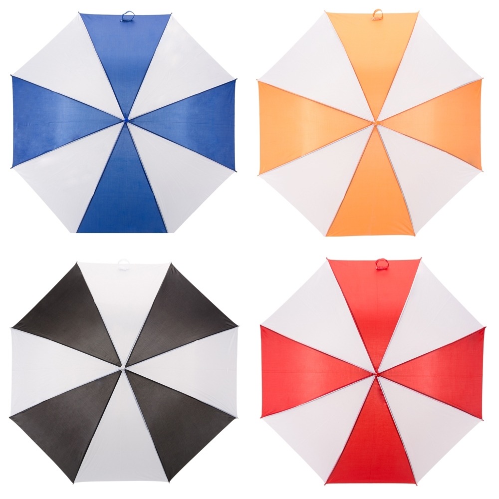 Guarda-chuva colorido com detalhes branco e tecido de nylon, basta acionar o botão inferior para abertura automática. Possui 8 varetas pretas de aço, pegador e bico superior de plástico.