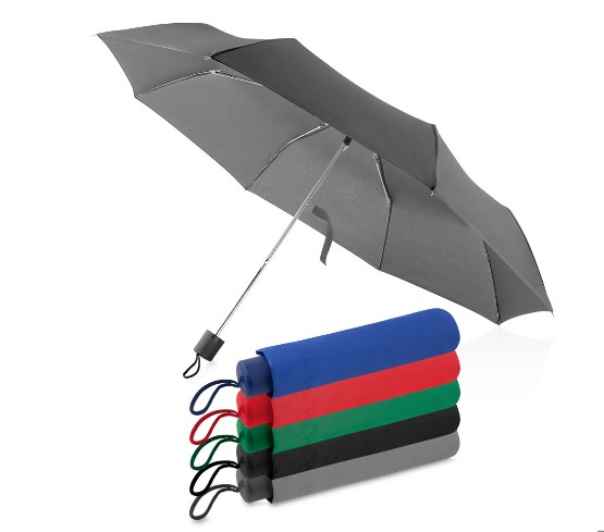 Guarda-chuva com cabo plástico e haste de metal, com capa protetora, abertura manual, tecido poliéster, com oito varetas.