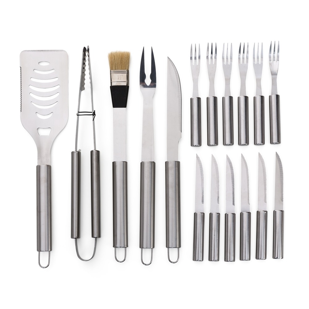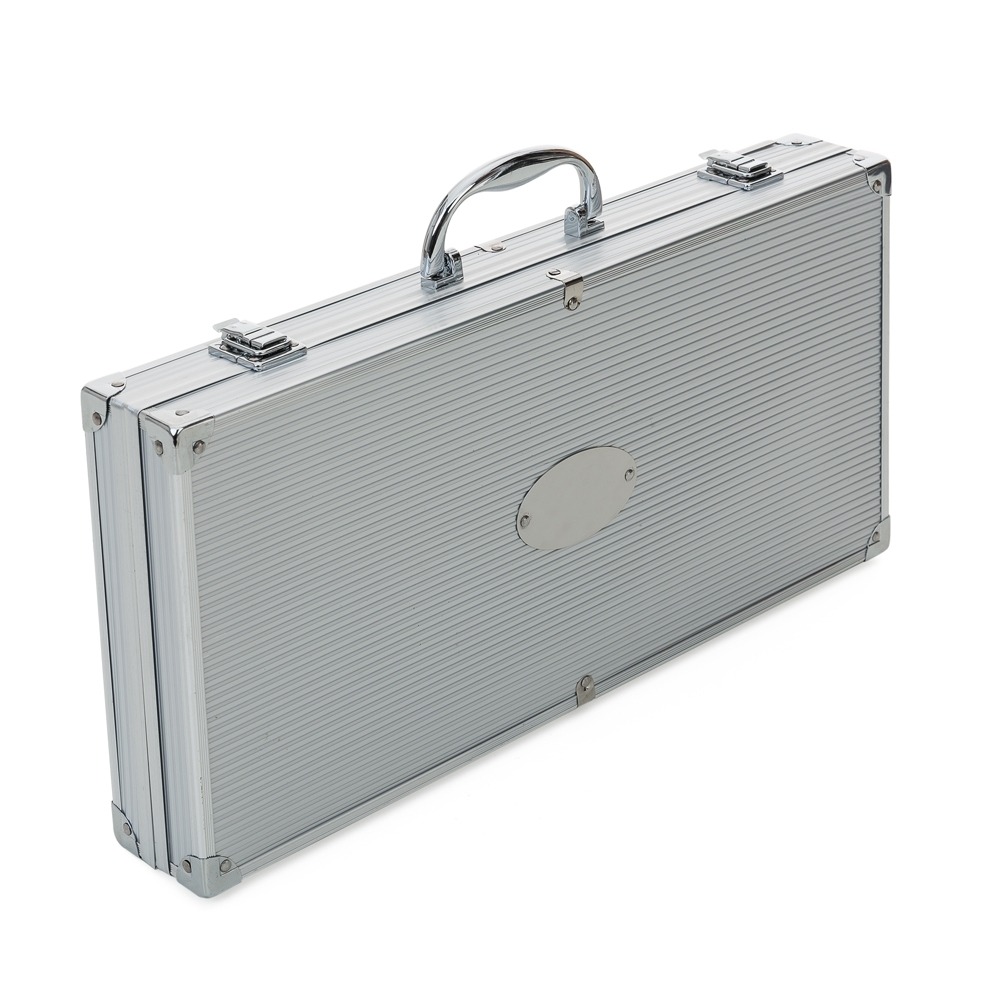 Kit churrasco 17 peças em maleta de alumínio com relevo e placa central para personalização. Possui: espátula(acompanha protetor plástico), pegador, pincel, garfo grande(acompanha protetor plástico), faca grande(acompanha protetor plástico), 6 facas pequenas e 6 garfos pequenos em inox. Detalhes em metal nas bordas da maleta, duas dobradiças na parte inferior, uma alça e duas presilhas para travar/abrir maleta. Parte interna revestida de tecido tnt e velcro para guardar as peças.