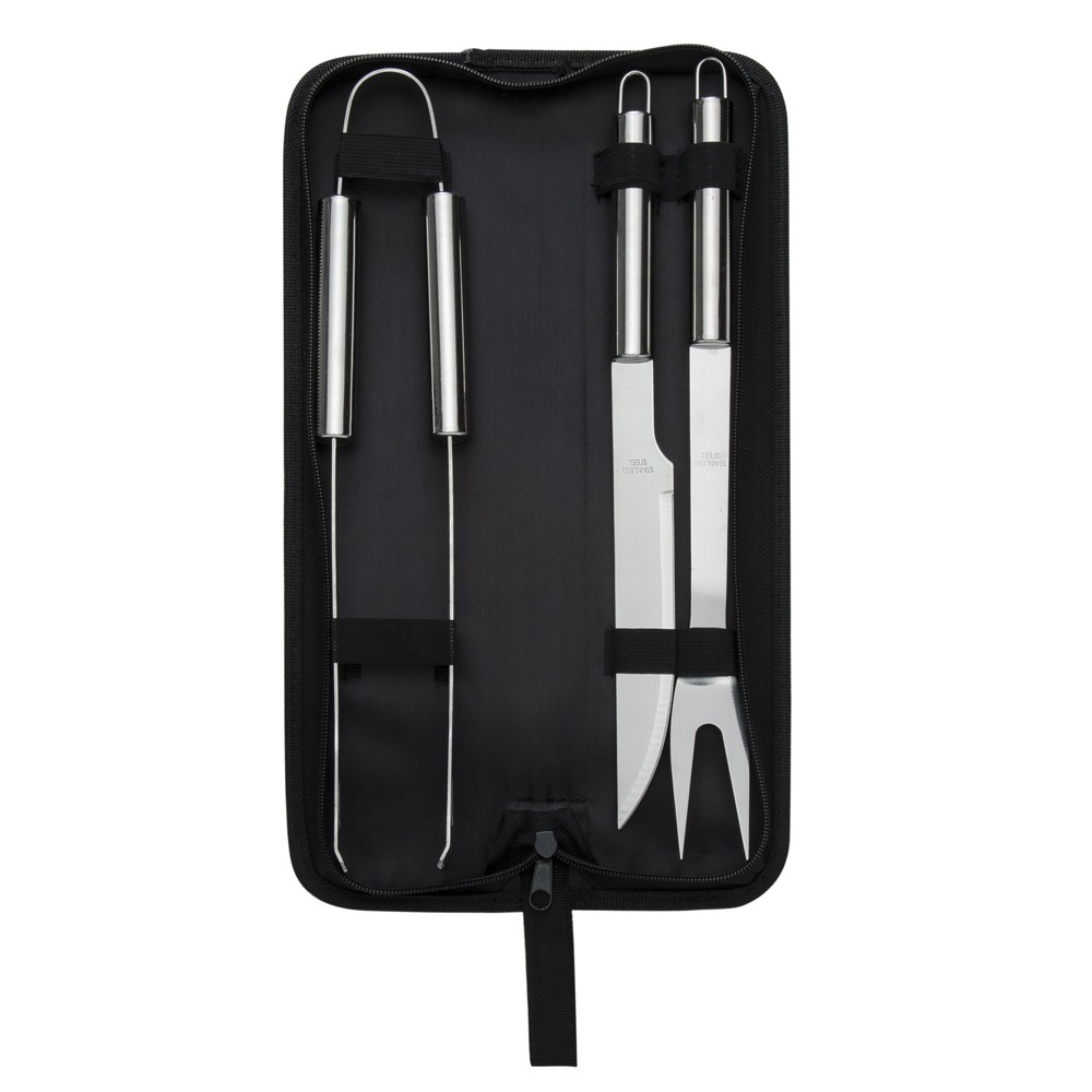 Kit churrasco 3 peças em estojo de nylon com alça. Possui: faca(acompanha proteção plástica), garfo(acompanha proteção plástica), pegador em inox e parte interna com velcro para guardar as peças. Estojo 37,2 cm x 9,1 cm – Faca 32,7 cm x 2,6 cm – Garfo 33,4 cm x 3,3 cm x Pegador 34,2 cm x 5,6 cm