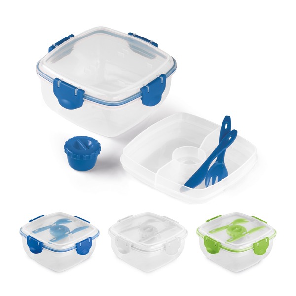 Marmita. PP. Com 3 compartimentos, garfo, faca e molheira.