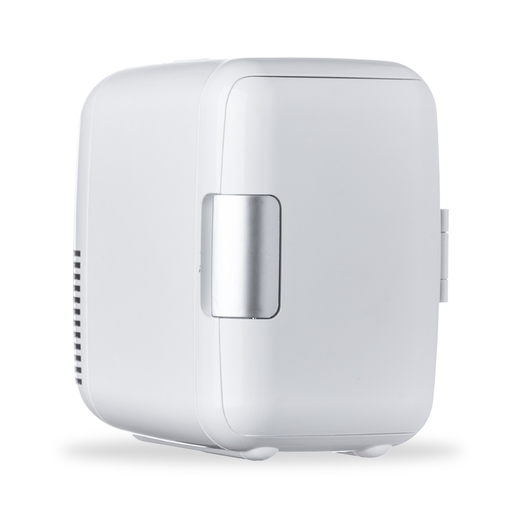Mini geladeira plástica portátil 4 litros na cor branca.