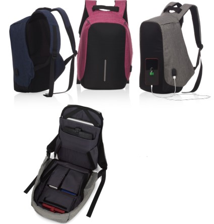 Mochila anti-furto de poliéster. Pensando na segurança do usuário foi confeccionado o compartimento principal na área traseira, impossibilitando a abertura do produto mesmo com a mochila na costa do usuário. Possui dispositivo com entrada USB na parte externa. Possui nas laterais internas sistema de velcro, maximizando a segurança da mochila.