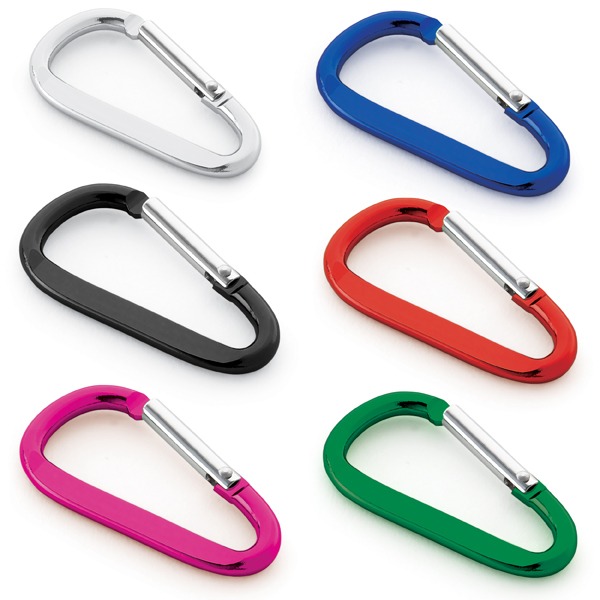 Mosquetão. Alumínio. Com área plana para gravação.