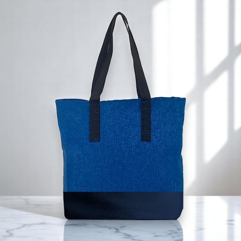 Sacola em Nylon mescla Azul com o fundo nylon 600, alça em fita CA 30mm e fechamento zíper.