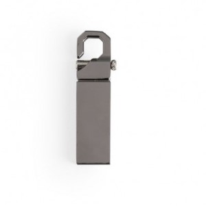 Descrição: Pen drive de metal com um gancho acoplado em sua extremidade. Possui um pino que quando é puxado abre o gancho para pendurar.