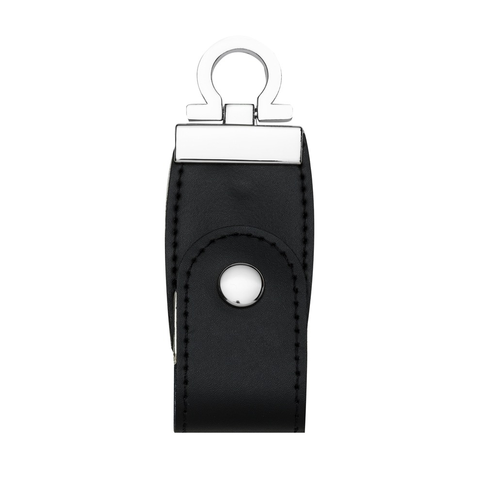 Pen drive 4GB de couro sintético com costura, possui botão e detalhes prata(verso liso). Parte inferior possui “argola” para utilizar como chaveiro.