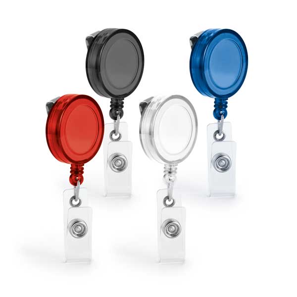 Porta crachá retratil com presilha metálica.